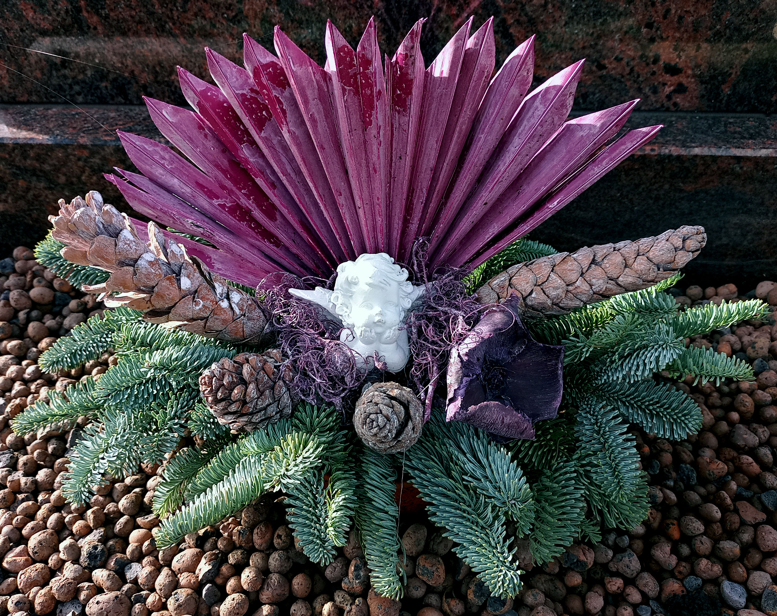 Gesteck zu Allerheiligen mit Tannenzweigen und kleinem Engel